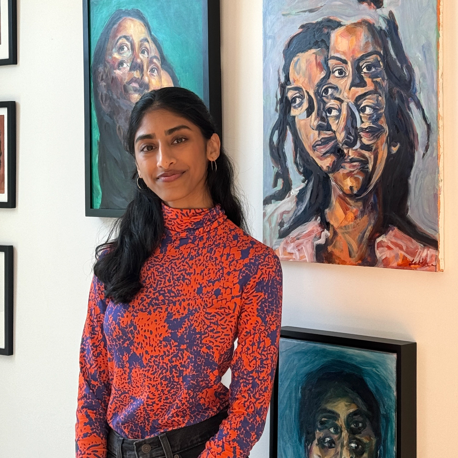 Latika Sridhar is a Brooklyn-based painter whose work explores themes of fragmentation and somatic memory. Working primarily in oil, she creates vibrant surreal portraits that combine multiple figures into one. Her practice incorporates aspects of intuitive painting and is influenced by psychotherapy models such as Internal Family Systems.